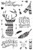 To add some detail to the background I used small images that came in the stamp set and stamped them randomly using Fog ink. To add a sentiment I heat embossed “Adventure Is Waiting” in white powder on black cardstock. To finish the card off I stitched along the edges to give it some texture and dimension and added it all onto a card base.